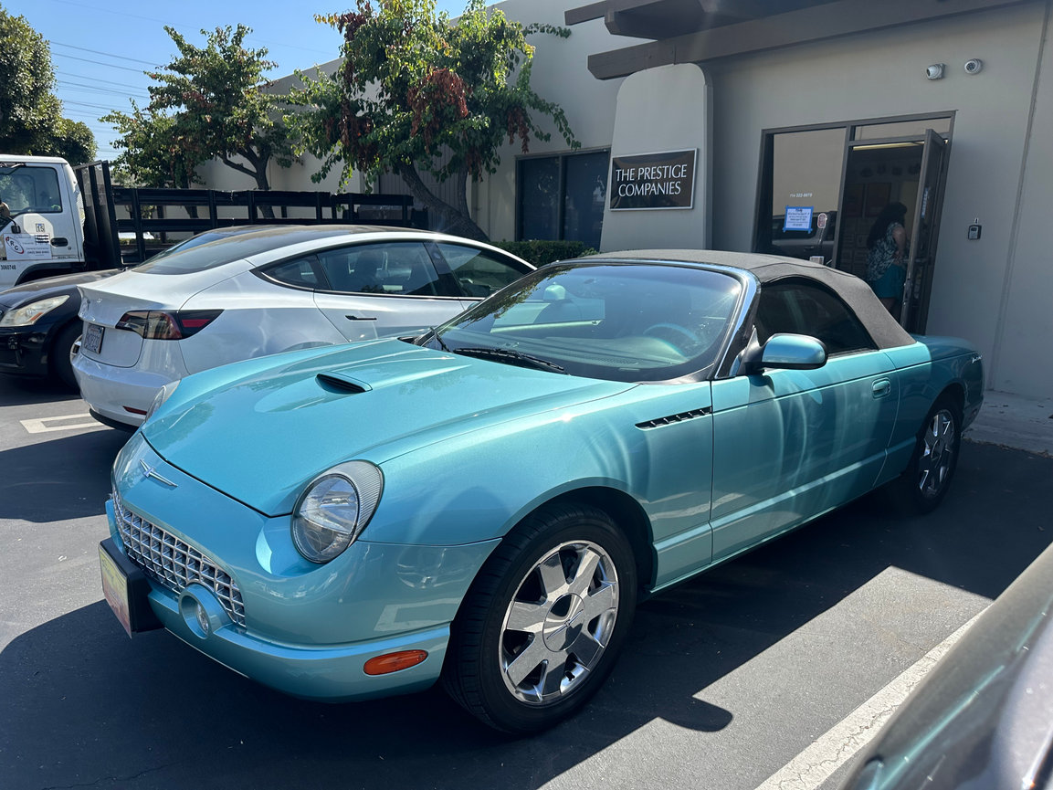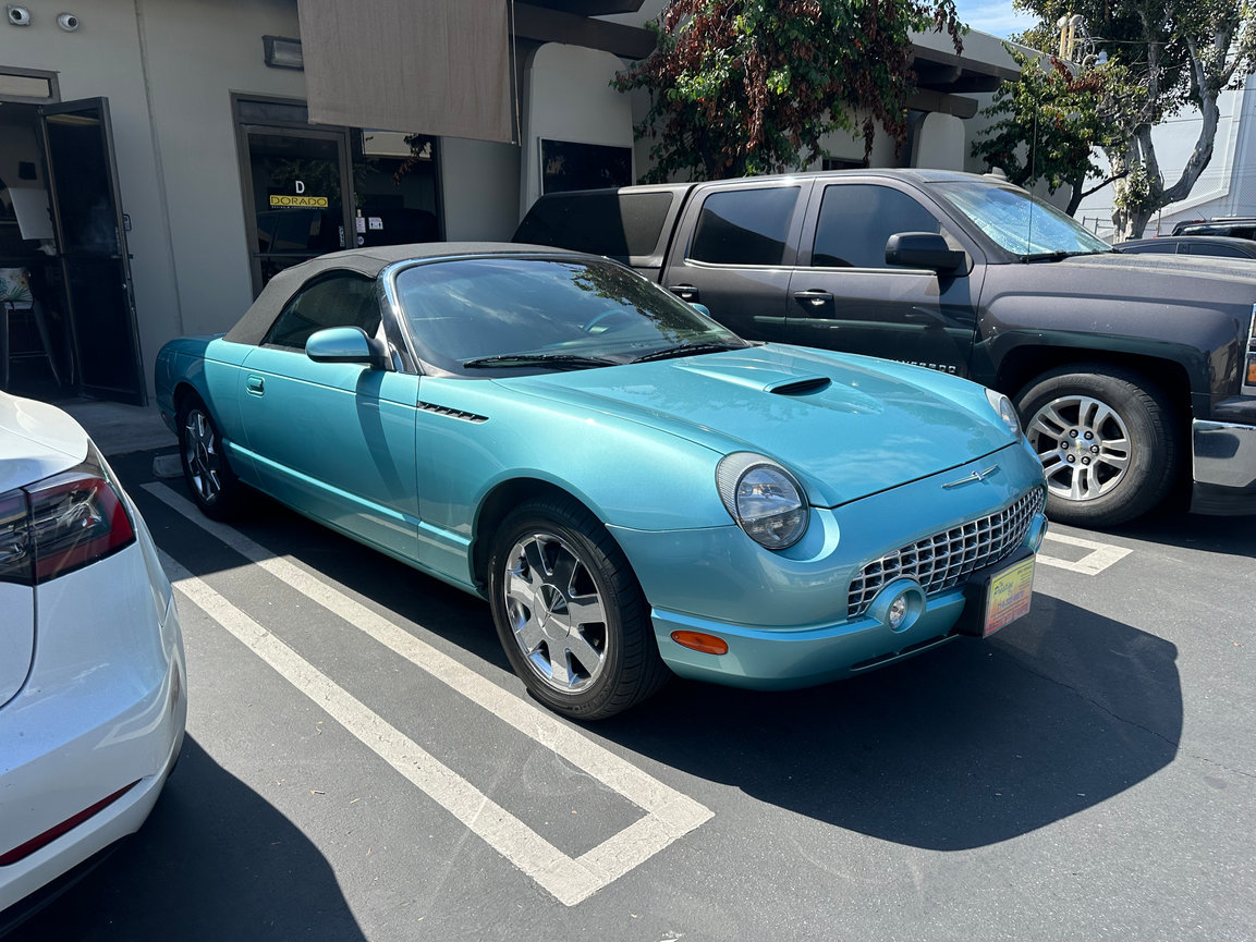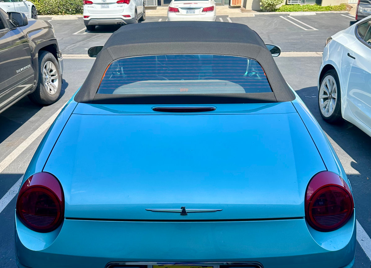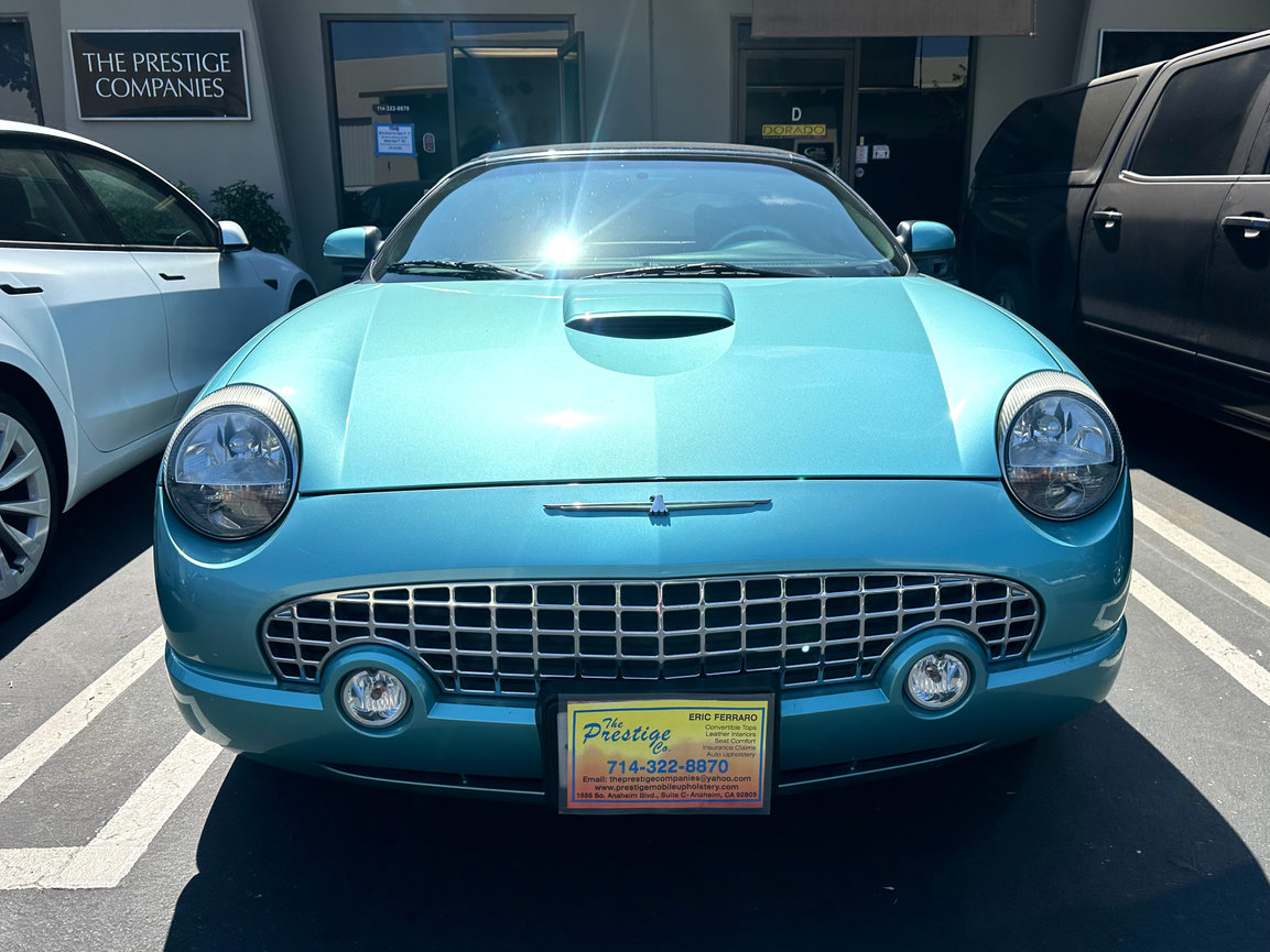This 2002 Ford T-Bird came in with a worn top and a falling rear window that we replaced with a sleek new black cloth top from Robbins Auto Tops. Check out the before and after!