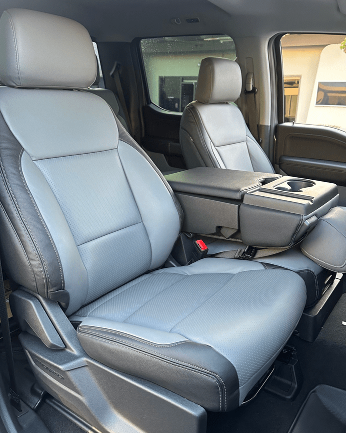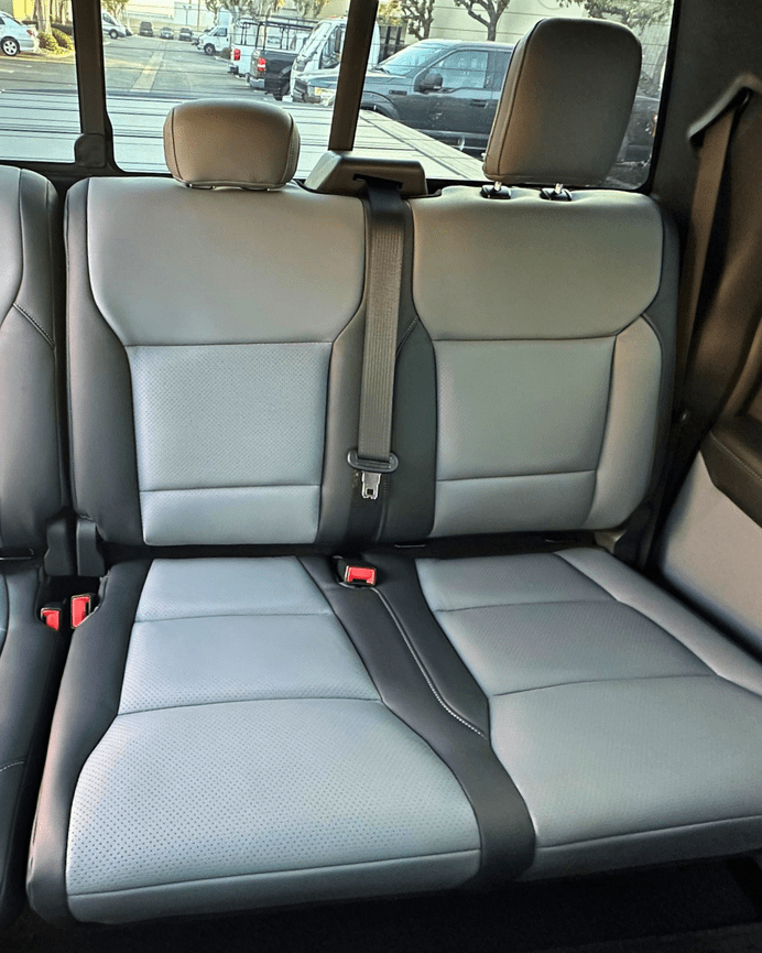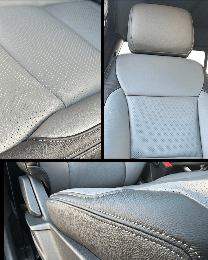 Reupholstered in Pantheon Grey and Ebony leather with perforated panels and contrast stitching for durability, comfort, and a clean factory-style finish suited to daily use.