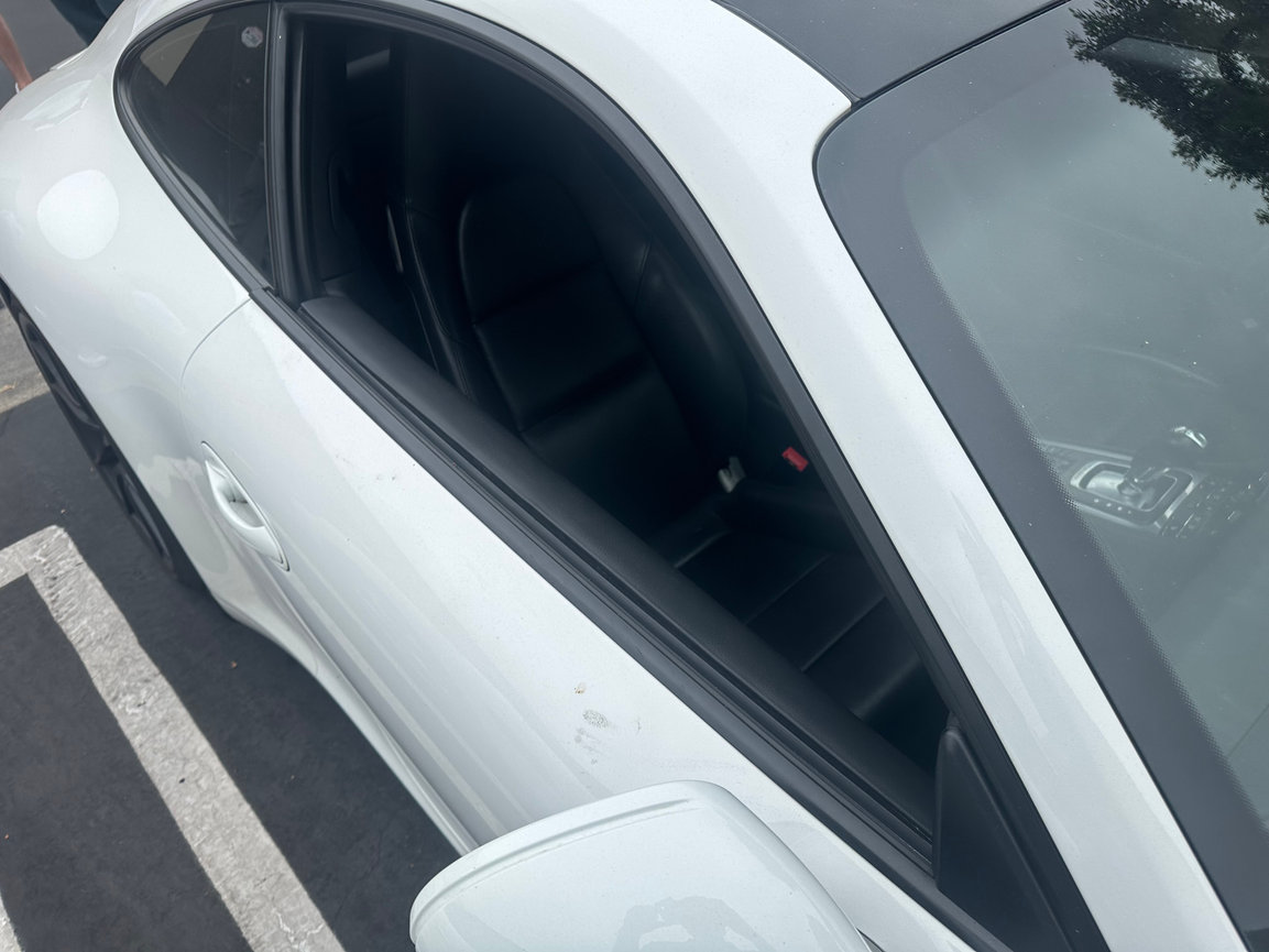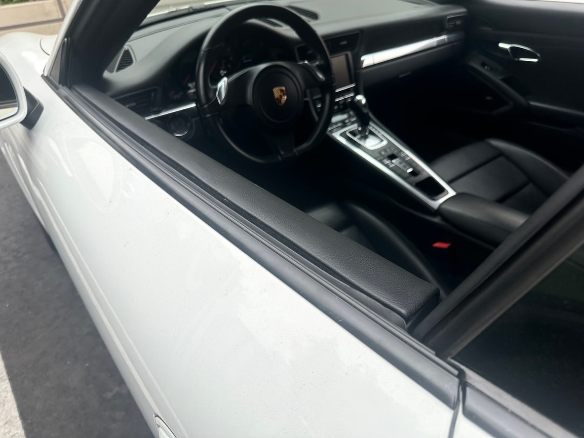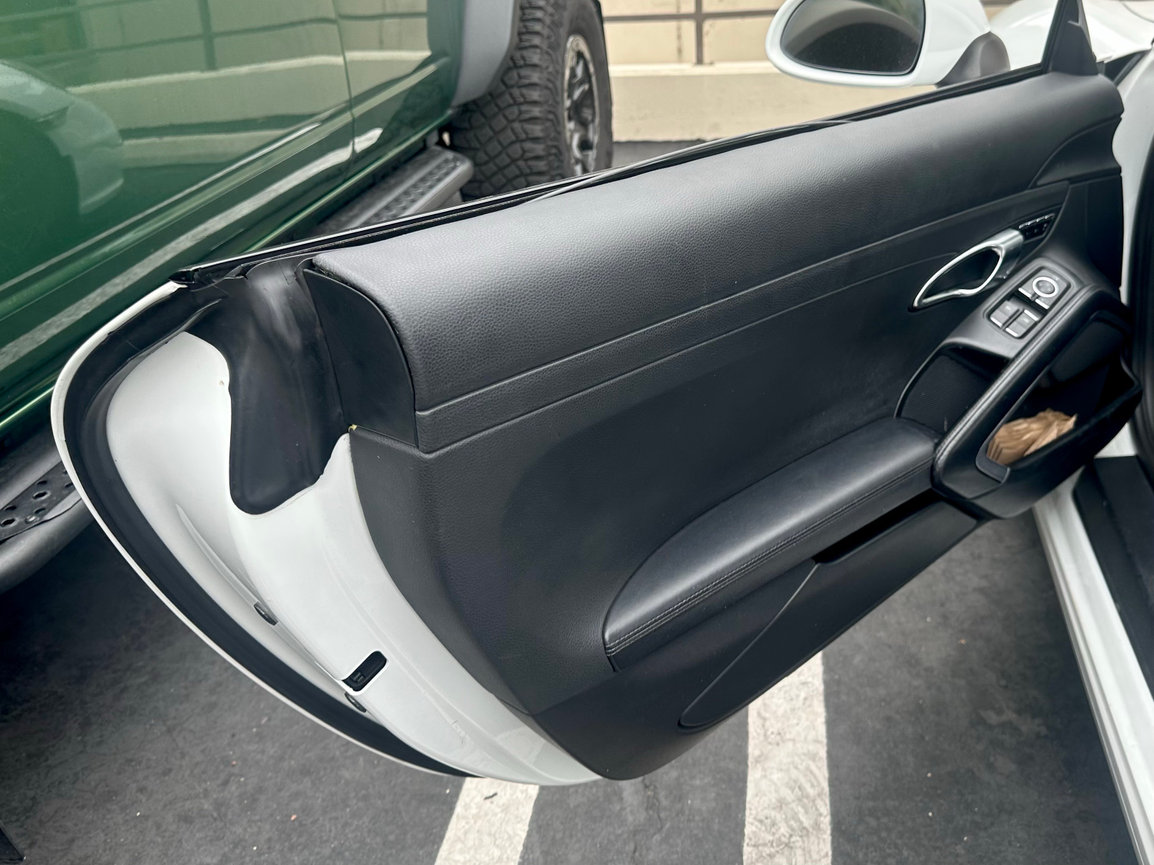 Sun and heat exposure are common causes of material lifting on door panels - we reupholstered these door panels in black leather and added a suede headliner to really give this Cayman a polished, luxe look!