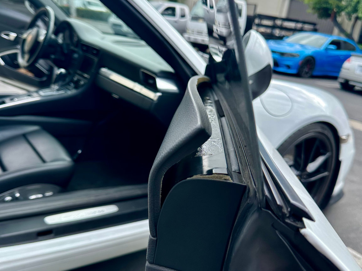 Door panel separation is one of the most frequent problems we address in Porsche interiors. Over time the factory adhesive can weaken in the upper portion of the interior door panel, particularly near the window opening, and can begin to lift. This not only creates unsightly gaps and warped leather but can eventually interfere with window mechanisms and overall door function if left untreated.